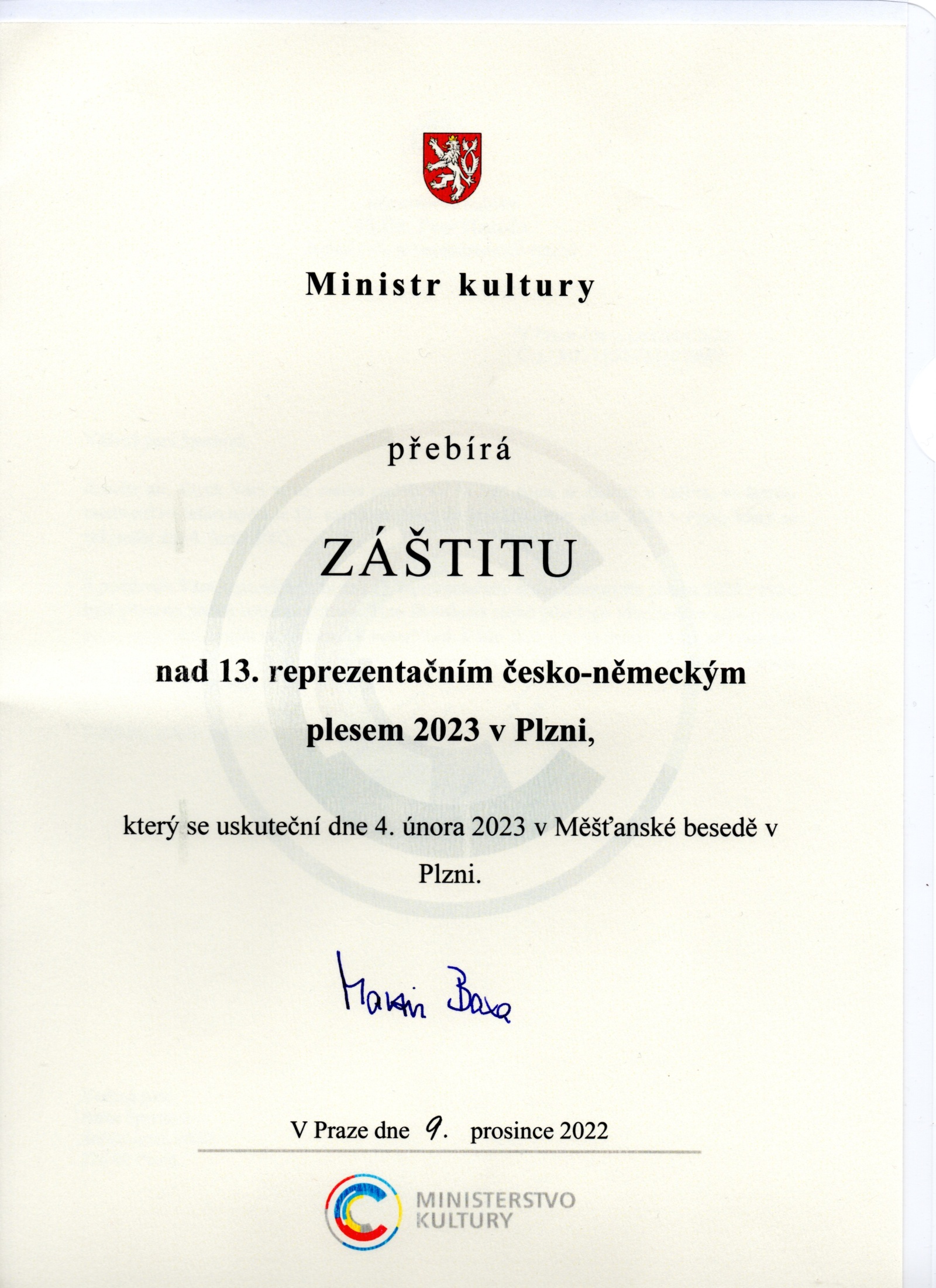 Je nám ctí, že záštitu nad plesem přijal Mgr. Martin Baxa, ministr kultury ČR.
